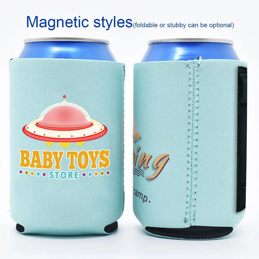 Magnetic stubby holder functionality integrates seamlessly into the overall design without compromising the insulation properties or customization surface area. The magnetic component allows users to attach the cooler to metal surfaces, providing added convenience in various settings including workshops, outdoor events, and recreational environments. This feature differentiates the product from traditional beer coozies while expanding potential use cases and user engagement opportunities.