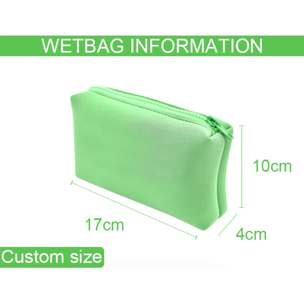 The bag's design incorporates strategic dimensioning that maximizes internal storage capacity while maintaining a compact external profile. The neoprene material offers natural cushioning properties that protect delicate cosmetic items from impact damage during transport or storage. The embossed logo area allows for permanent branding without compromising the bag's waterproof characteristics, making it suitable for promotional applications or retail branding initiatives. The swimming-specific design elements ensure optimal performance in aquatic environments while remaining equally effective for general cosmetic storage purposes.